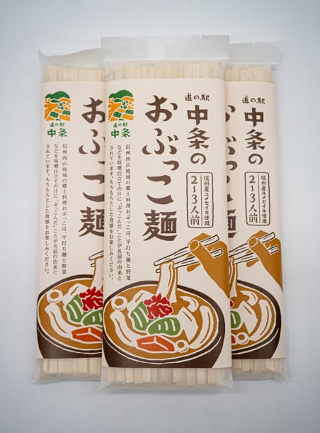 おぶっこ麺(乾麺)は、信州産ユメセイキを使用し、こだわり抜いた製法で仕上げた道の駅中条が誇るオリジナル商品です。素朴な味わいを楽しむことができます。